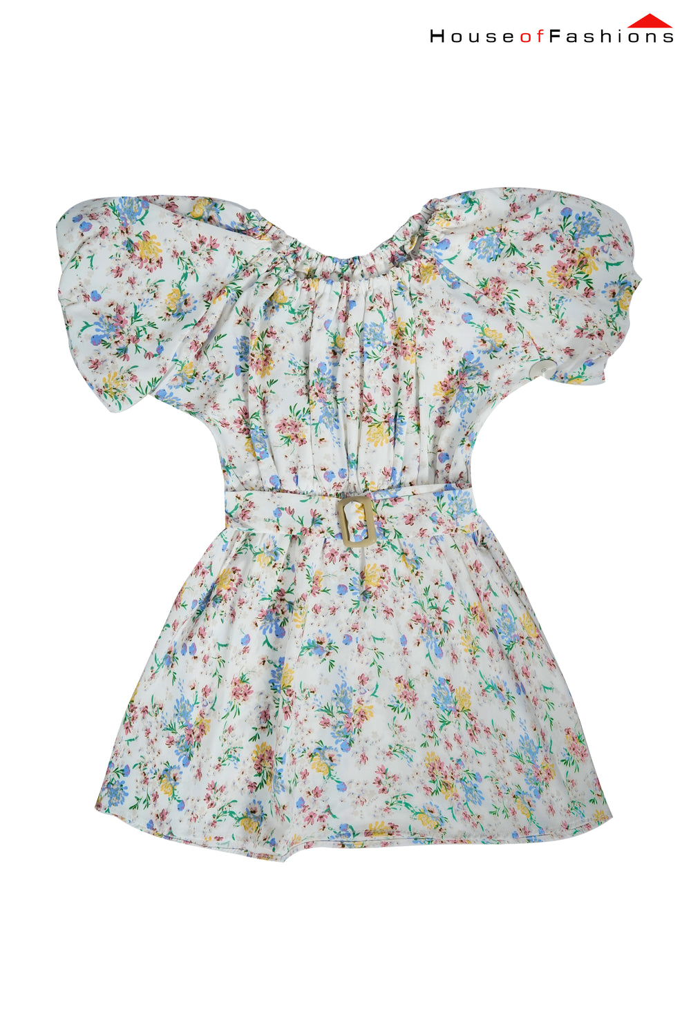 Made from lightweight, breathable cotton fabric, this charming piece features a pastel floral print on a soft ivory base — bringing a touch of springtime freshness to any occasion. The voluminous puff sleeves add playful drama, while the elastic neckline and matching fabric belt with buckle create a flattering, comfortable silhouette.