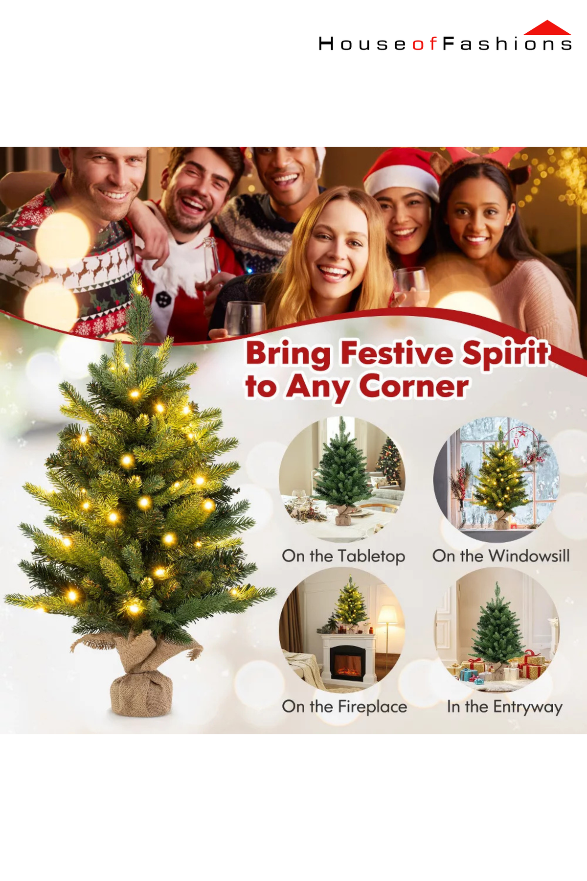 Create a warm, festive ambience anywhere in your home with this charming 60 cm (2 ft) Pre-Lit Mini Christmas Tree, exclusively from House of Fashions. Designed with realistic pine needles, built-in lights, and a rustic burlap-wrapped base, this compact tree is perfect for tabletops, desks, entryways, and small spaces.