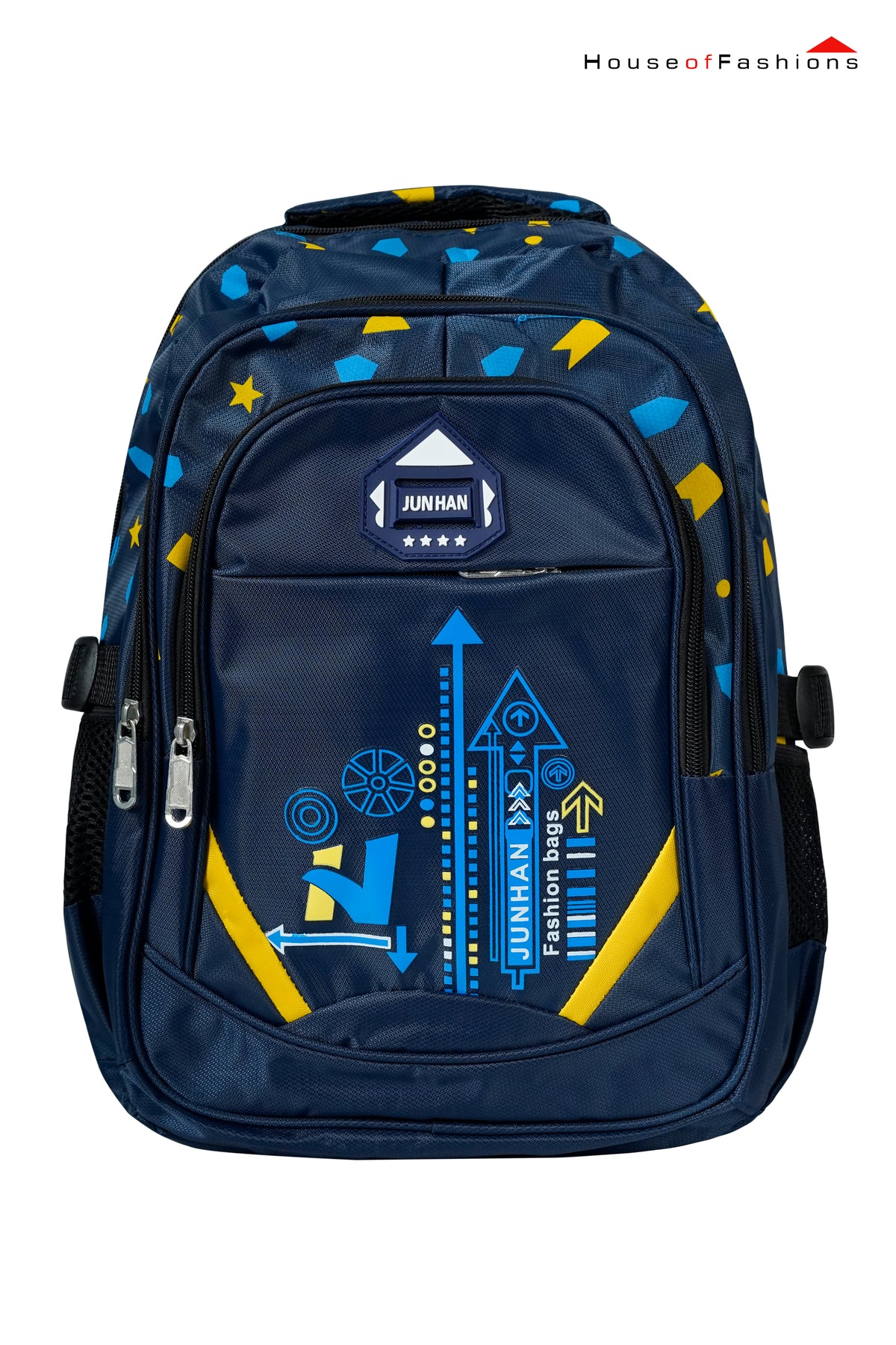 Fuel your child's school day with this bold and practical navy blue backpack by JUNHAN. Featuring eye-catching arrow graphics and colorful geometric prints, this bag is both fun and functional. Built with durable compartments, side mesh bottle holders, and padded shoulder straps, it’s the perfect school companion for energetic kids who carry books, lunch, and creativity in their backpack.